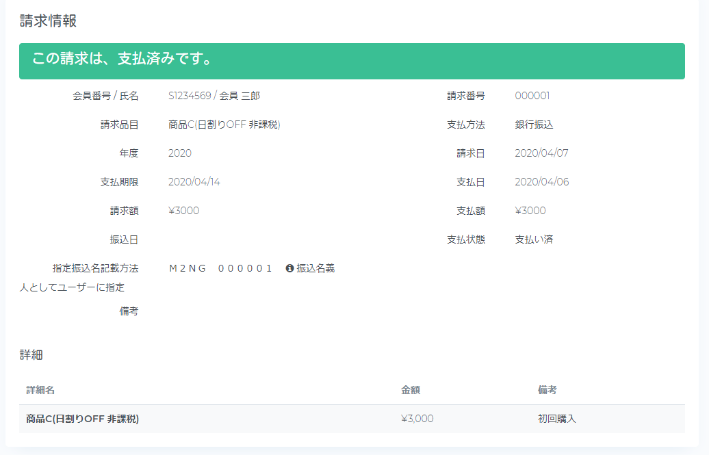 - 請求に紐づく入金がある場合のみ入金情報が表示されます。